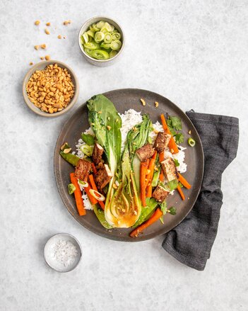 Gebratener Pak Choi, ergänzt mit Karottenstiften, Frühlingszwiebeln und Tofuwürfeln präsentiert sich auf einem Reisbett im Zentrum des Tellers. Rundherum stehen kleine Schalen mit Reis, gehackten Erdnüssen und Frühlingszwiebel - Ringen.  | © SONNENTOR