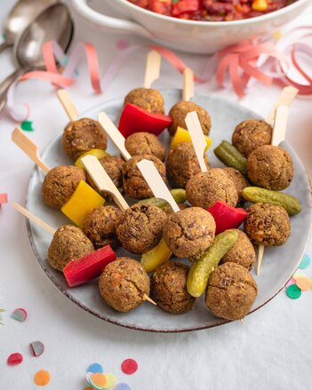 Die Linsenbällchen sind gemeinsam mit kleinen Essiggurkerln und Paprikastücken auf Holzspieße gespießt, diese liegen auf einem Teller.  | © SONNENTOR