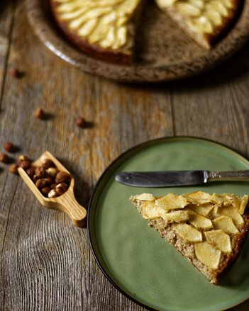 Auf dem Foto ist ein Stück Apfelkuchen zu sehen. Daneben sieht man Haselnüsse und im Hintergrund steht der restliche Kuchen. | © SONNENTOR