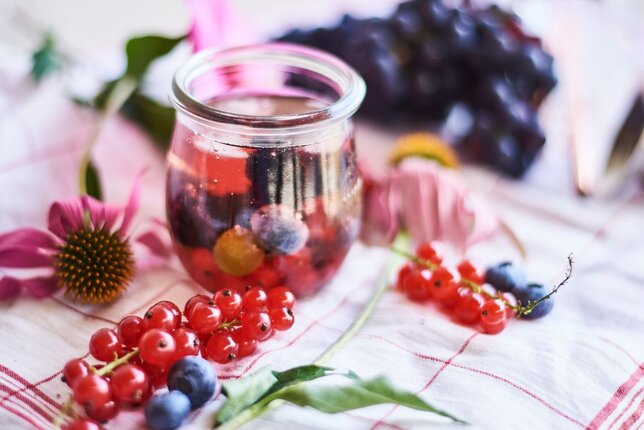 Auf dem Foto sieht man eine Cocktail Bowle. Daneben sind Heidelbeeren und Ribisel zu sehen. | © SONNENTOR