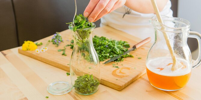 Zusätzlich kannst du Kräuter, Früchte, Wurzeln, Blüten oder Gewürze dazugeben. Achte nicht nur auf die geschmacklichen Qualitäten, sondern auch auf die Wirkungen der Pflanzen, die du hinzufügst.